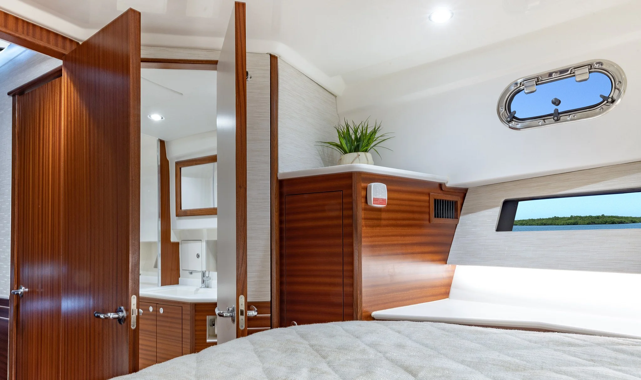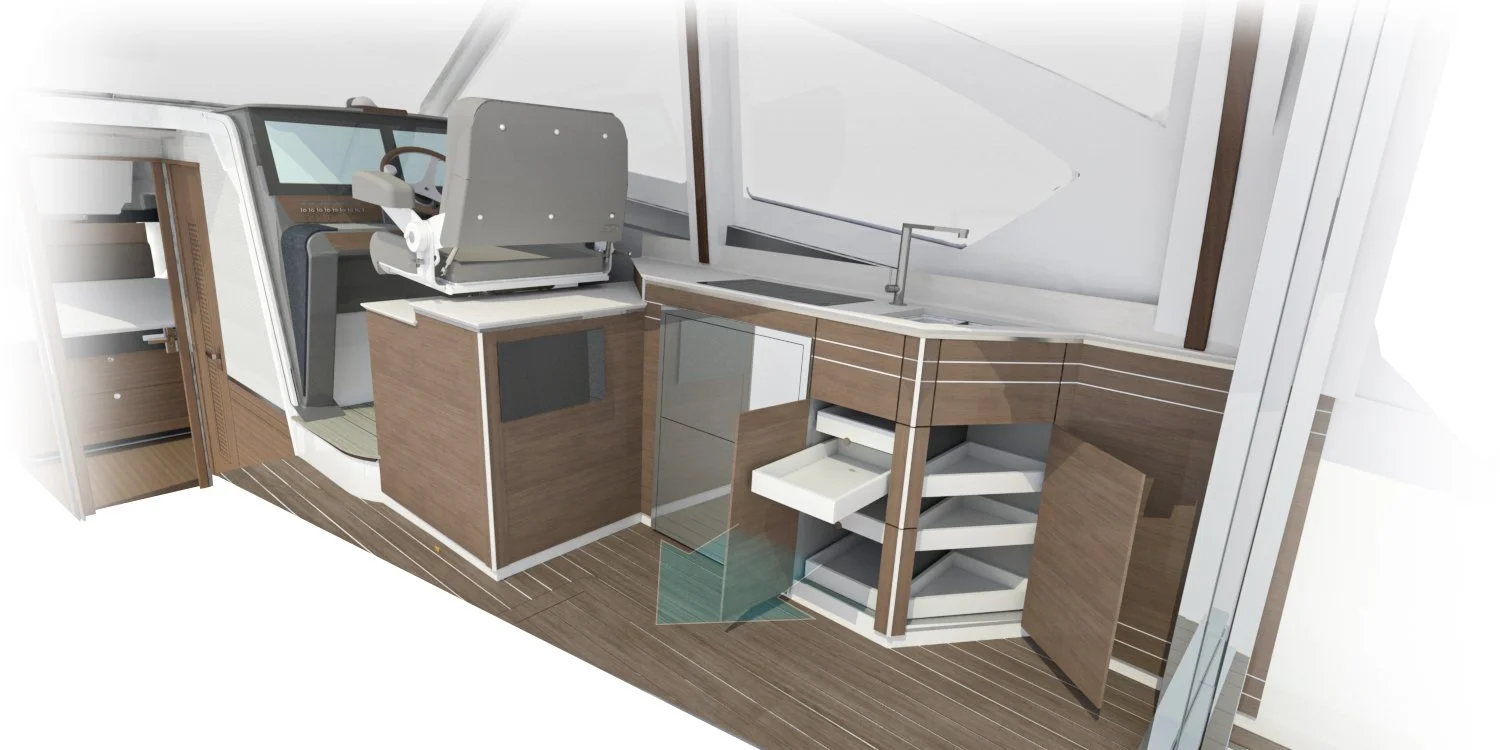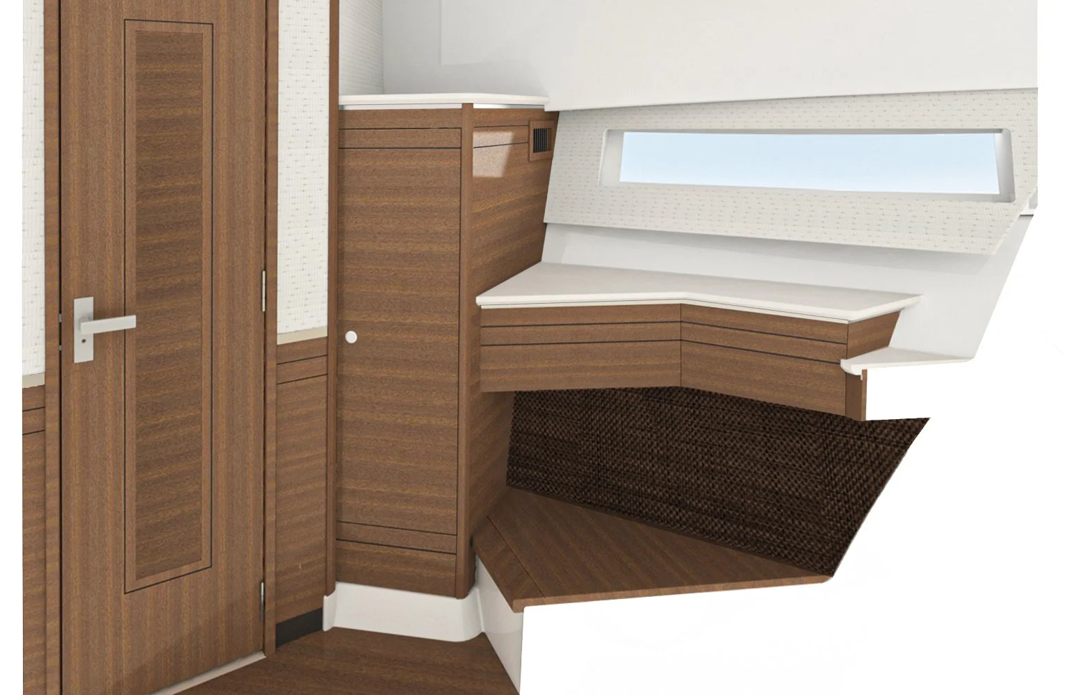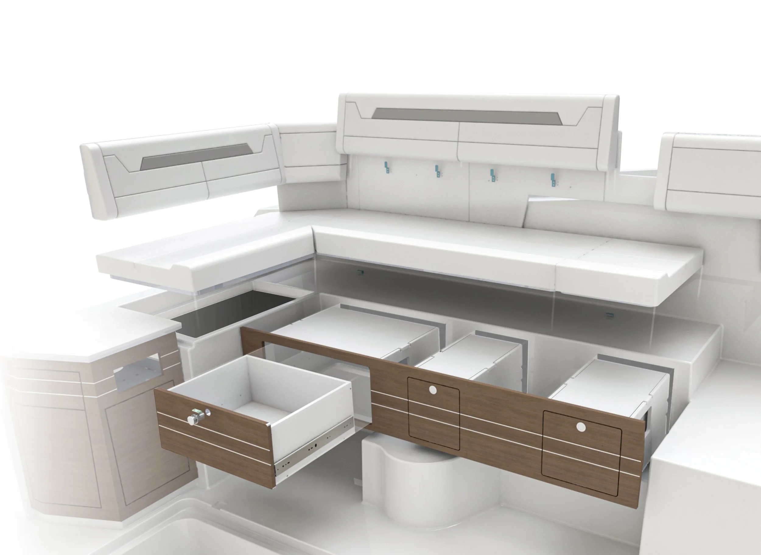 One of the goals for the OS 445 was to create a luxurious and elevated bridgedeck. To achieve this, Connor designed sleek and timeless upholstery patterns that complement the strong lines of the cabinetry. The aim was to maximize storage while maintaining aesthetics and a pleasing feel. Although there were many challenges in reaching this goal, they ultimately led to some creative solutions.
