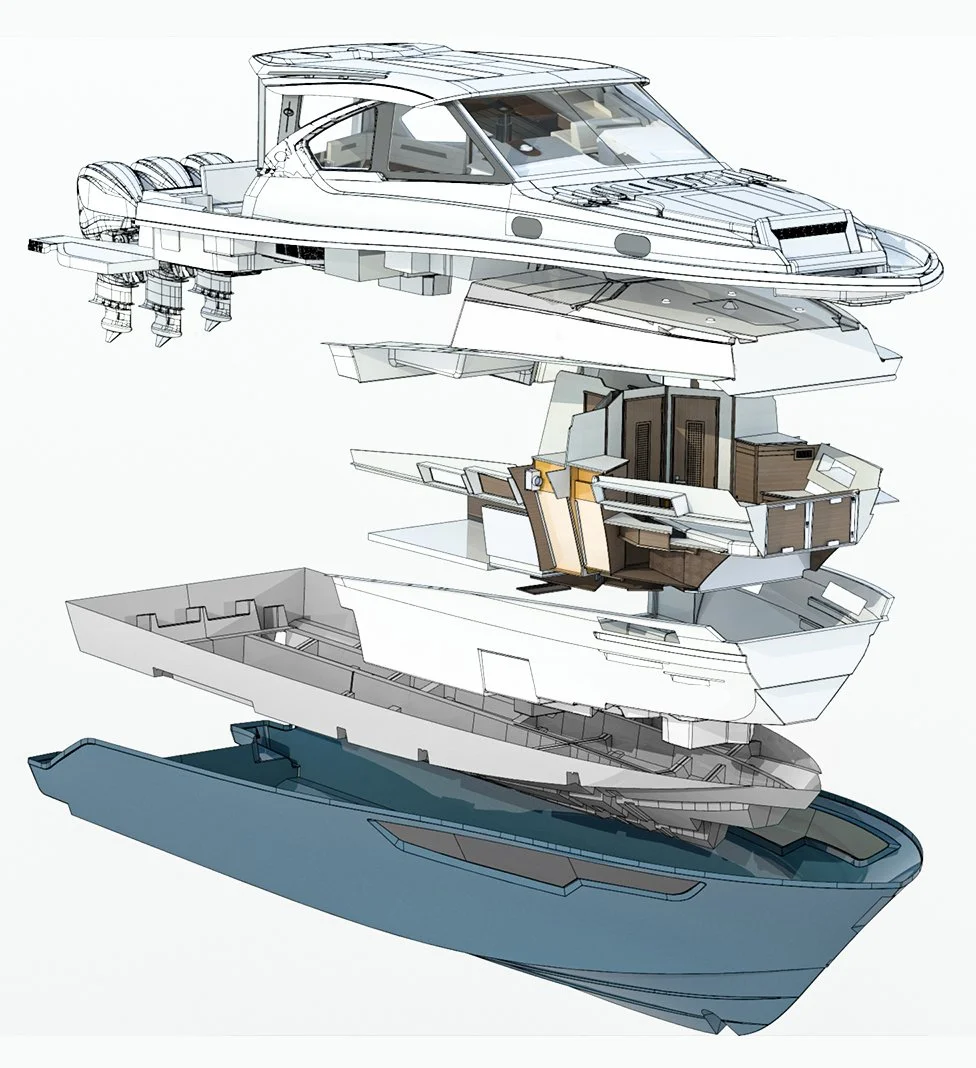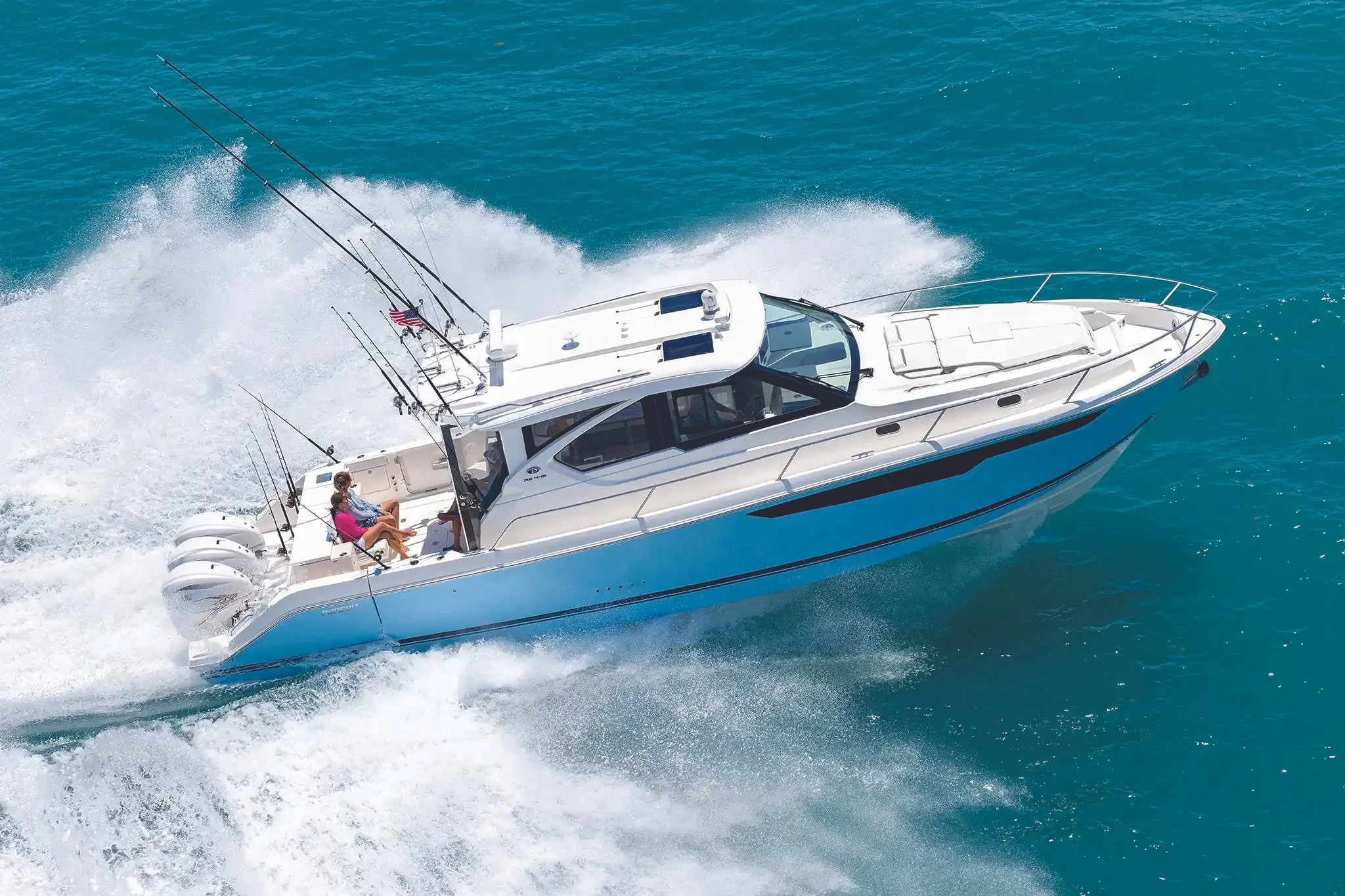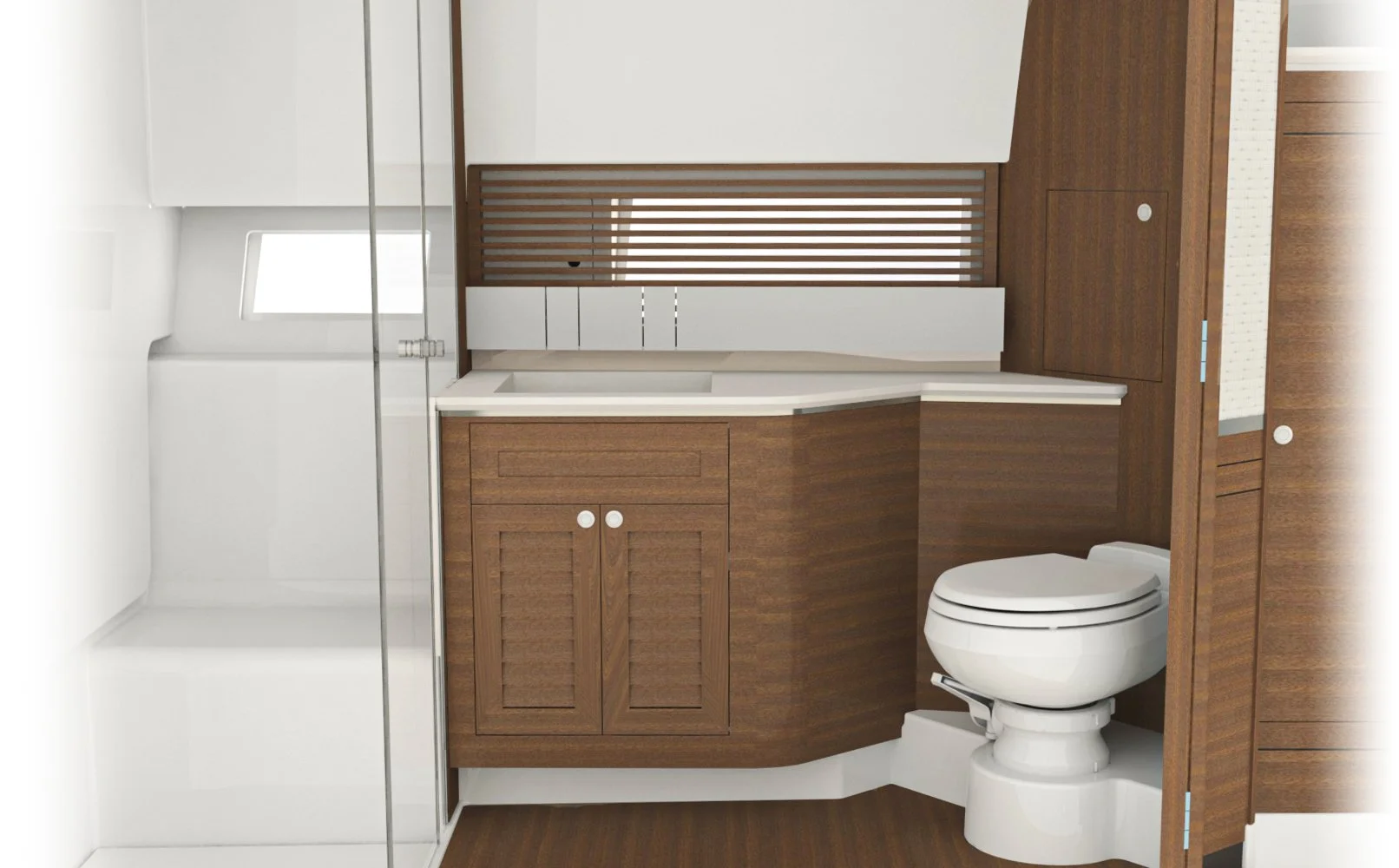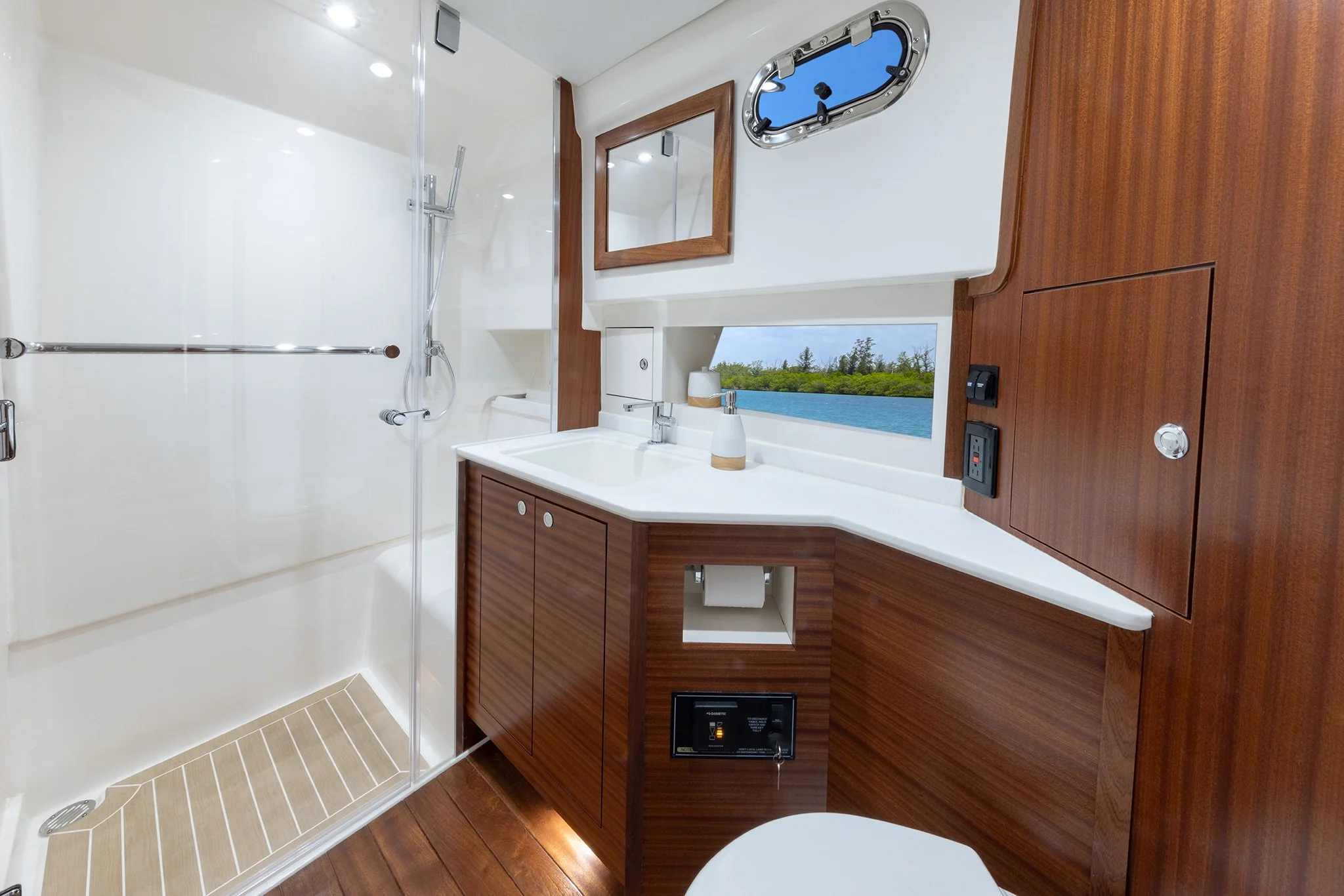 One of the goals for the OS 445 was to create a luxurious and elevated bridgedeck. To achieve this, Connor designed sleek and timeless upholstery patterns that complement the strong lines of the cabinetry. The aim was to maximize storage while maintaining aesthetics and a pleasing feel. Although there were many challenges in reaching this goal, they ultimately led to some creative solutions.